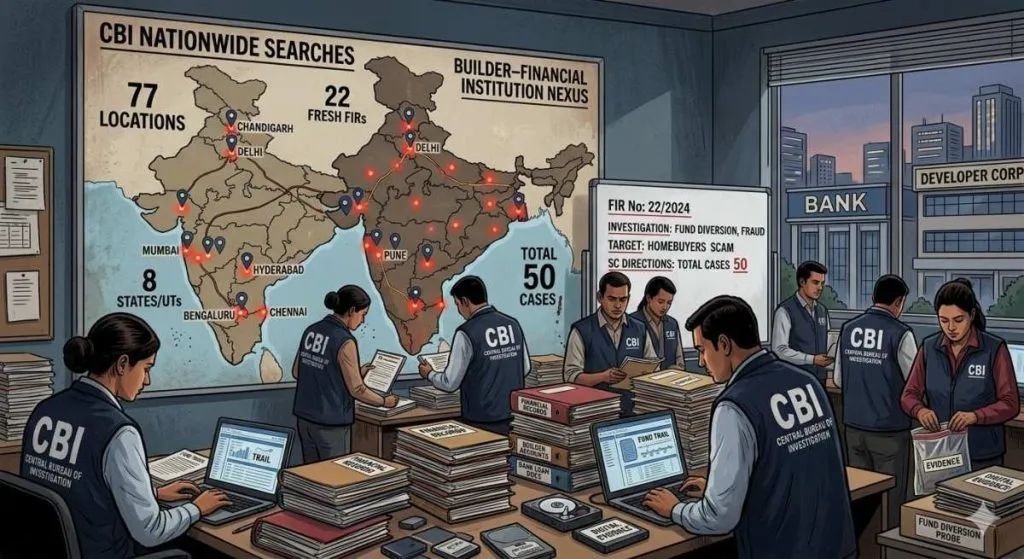 बिल्डर्स आणि बँकांच्या ‘साटलोट्या’वर सीबीआयचा प्रहार नवी दिल्ली -सीबीआयने ८ राज्यांच्या ७७ठिकाणांवर मंगळवारी छापे टाकले आहेत. ही मोठी कारवाई काही बिल्डर्स आणि वित्तीय संस्थांमधील संगनम