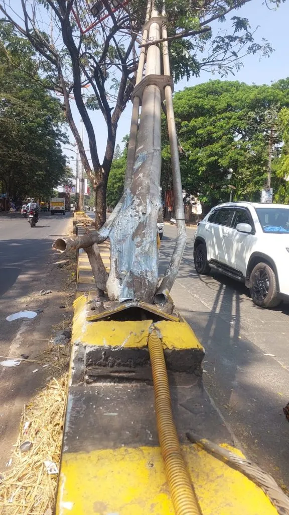 गोगटेसर्कलयेथीलप्रकार बेळगाव : गोगटे सर्कल येथे अज्ञात वाहनाने धडक दिल्यामुळे दुभाजकावरील डेकोरेटिव्ह पथदीप कलंडला आहे. यामुळे धोका निर्माण झाला असून, तो विद्युतखांब केव्हा कोसळेल याची