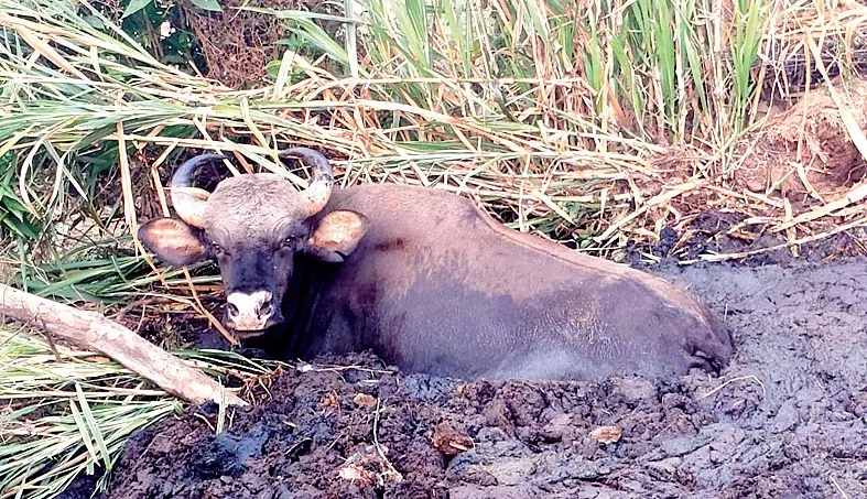 Satara News : पाटण तालुक्यातील येराड गावात शेणकीत अडकला रानगवा
